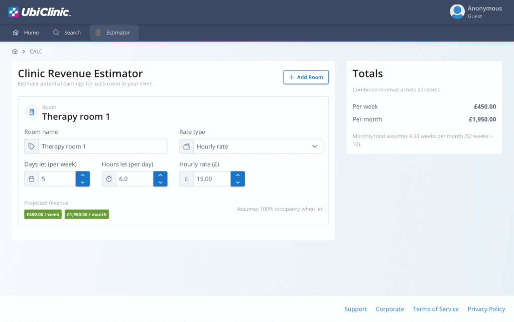 Simply enter your clinic's rooms, the planned list price by day or by hour, and adjust the occupancy to estimate weekly and monthly earnings. You'll get an instant estimate per-room, as well as the total from all your rooms.